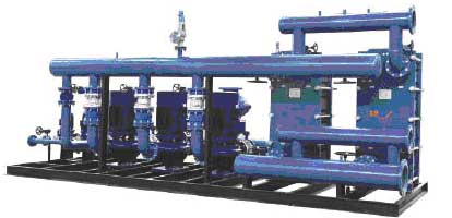 公司的板式换热器-换热机组由高效传热波纹板片及框架组成,板片由螺栓夹紧在固定压紧板及活动压紧板之间,在换热器内部构成了许多流道,板与板之间用橡胶密封。